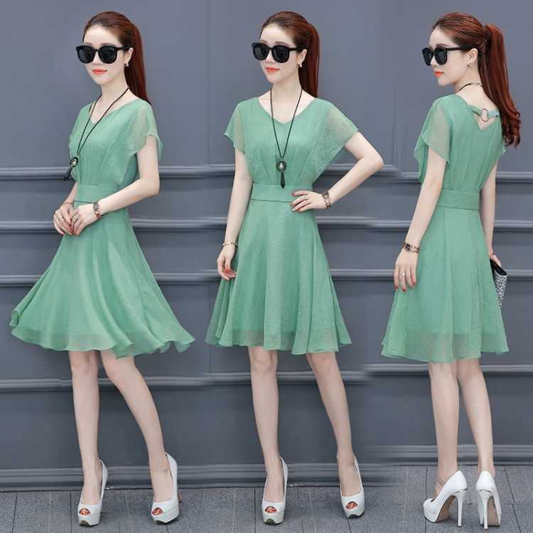 连衣裙女夏新款韩版收腰显瘦a字裙淑女气质V领中长款雪纺裙子